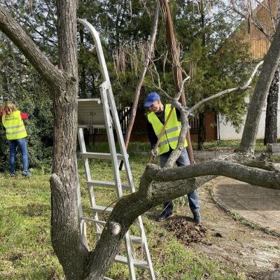 Itt használhattuk először a Városi Civil Alap pályázaton elnyert pénzből vett parkgondozási gépeinket és eszközeinket. Ezekkel a munka gyorsabban és profibban zajlott. Megszépült a park a bokrok, sövény, fák metszése, alakítása, a száraz, illetve a vezetékbe lógó ágak levágása eredményeként. Emellett a száraz leveleket összeszedtük és a burkolt felületeket gyomtalanítottuk.